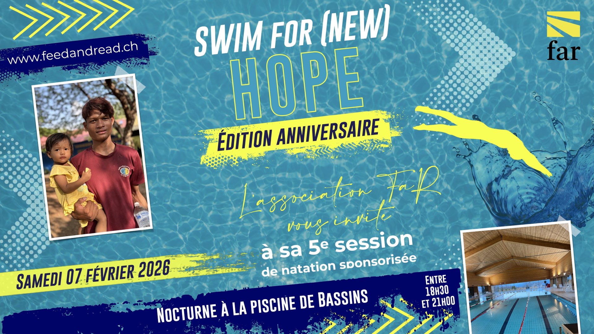 Venez participer à notre soirée de natation caritative pour soutenir l’orphelinat New Hope en Ethiopie. Ensemble, nous pouvons faire une réelle différence dans la vie d’enfants qui en ont le plus besoin. Vous pouvez soit nager, soit sponsoriser un(e) nageur(euse), soit venir encourager !